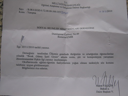 Aylarca bu yarışmayı hazırlamak için çalıştık... Yarışmanın konusunu ve sloganını belirlemek için pek çok beyin fırtınası yaptık... Heyecanla çalıştık... Harika bir web sayfası hazırlanması için elimizden gelen tüm çabayı gösterdik... Ve son olarak yarışmanın daha geniş bir kesime duyurulması için Milli Eğitim Bakanlığı ile irtibata geçtik... Aldığımız cevap aşağıda... Anlam veremiyoruz!... Sadece üzüntü duyuyoruz!....