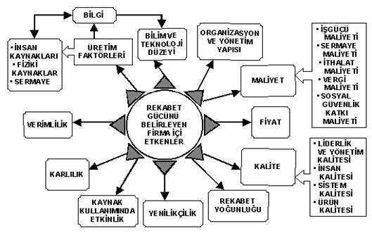 Firma içi etkenler arasında firmanın ürettiği malların kalitesi, maliyeti ve fiyatı önem taşımaktadır. Maliyetler arasında da işgücü maliyeti, sermaye maliyeti, ithalat maliyeti, vergi maliyeti, sosyal güvenlik maliyeti ve benzeri maliyet faktörlerini gözönüne almak gerekir. Bunun dışında verimlilik, karlılık, firmada kullanılan bilgi teknolojisi, organizasyon ve yönetim yapısı, kaynakların etkin kullanımı, yenilikçilik ve yaratıcılık gibi faktörler rekabet gücünü belirleyen firma içi diğer etkenlerdir. Rekabet gücünü belirleyen başka etkenler de bulunmaktadır. Bu etkenler arasında, firmanın faaliyette bulunduğu sektördeki rekabet yoğunluğu, firmanın malın fiyatını tespit etmede ne ölçüde güçlü olduğu, sektördeki ölçek ekonomileri, işgücünün verimliliği, firmanın organizasyon ve yönetim biçimi, kapasite kullanım oranı, sermaye piyasalarındaki finansman koşulları ve benzeri faktörler sayılabilir. (Bkz . Şekil 1).