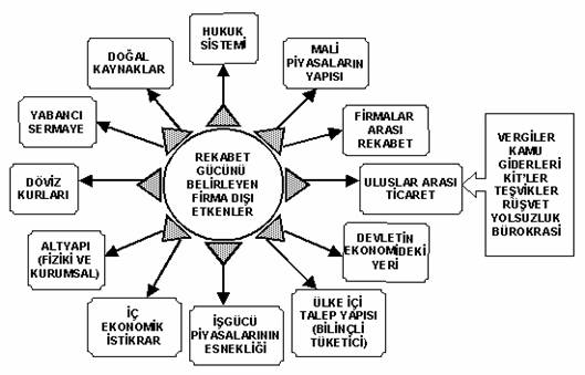 Rekabet gücünü belirleyen firma dışı etkenler ise; yine bir değil, pek çoktur (Bkz. Şekil-2). Bunlar arasında en başta devletin ekonomideki yeri ve ekonomiye devlet tarafından yapılan müdahaleler önem taşımaktadır. Uluslararası rekabet gücünü belirleyen firma dışı etkenler arasında uluslararası ticaret sistemi, tüketicilerin bilinç düzeyi, işgücü piyasalarındaki esneklik düzeyi, ülke içi ekonomik istikrar, ülkenin doğal kaynakları ve doğal zenginlikleri, hukuk sistemi, piyasadaki rekabet düzeyi ve mali piyasaların gelişmişlik düzeyi vesaire faktörler de önem taşır.
