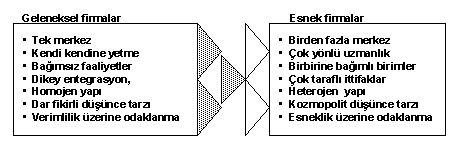 ▫ Esnek organizasyonlar. Günümüzde Taylorcu organizasyon biçimi yerini esnek organizasyonlara bırakmaktadır. Bu tip organizasyonlar, kaynak israfını azaltarak ve üretim sürecinin her aşamasına değişen koşulları dikkate alan yaratıcı düşünce tarzını entegre ederek emek ve sermayenin verimliliğini artırır; bilgi akışı açısından işlevsel olmayan orta düzey yönetimin bir çok katmanını ortadan kaldırır ve aşırı uzmanlaşma ve bölümlere ayırma uygulamasını çok boyutlu iş sorumluluğunu tanımlayarak ve timler ve mesleki rotasyonu kullanarak engeller. Esnek organizasyonlar, esneklik ve üstün ürün kalitesini kitlesel üretimden kaynaklanan düşük birim maliyetler ile hızla birleştirir. Taylorcu üreticiler, zanaatkar üreticilere göre standart ürünlerin üretiminde ölçek ekonomileri yoluyla daha üst düzeyde bir verimlilik elde ederken esnek organizasyonlara sahip üreticiler ölçek ekonomisinden taviz vermeksizin birçok ürünün üretiminde ve hizmetlerin sunulmasında kapsam ekonomilerinden ve çalışanlarının beşeri yeteneklerinden tam olarak yararlanmak suretiyle verimliliklerini bir üst düzeye çıkarabilmektedirler. Öte yandan, bilgi ekonomisinde teknolojik değişim ve yenilikler kalifiye işgücü lehine işlemektedir. Yeni yüksek performanslı işyerleri ve esnek işletmeler inisiyatif, yaratıcılık, problem çözme, değişime açıklık v.b. gibi işgücü niteliklerine önem vermekte ve bu yetenekler için daha yüksek bir ücret ödemeyi kabul etmektedir. (Şekil 5.)